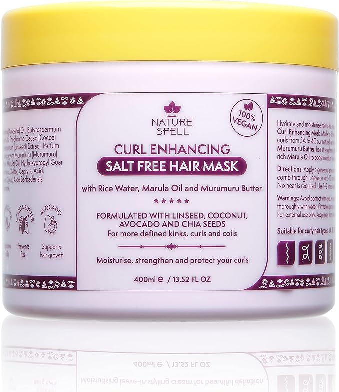 Маска для кудрявых волос от Nature Spell 400 мл - С рисовой водой и льняным семенем, для всех типов локонов, маска для волос без сульфатов, 100% веганская, Сделано в Великобритании, белая