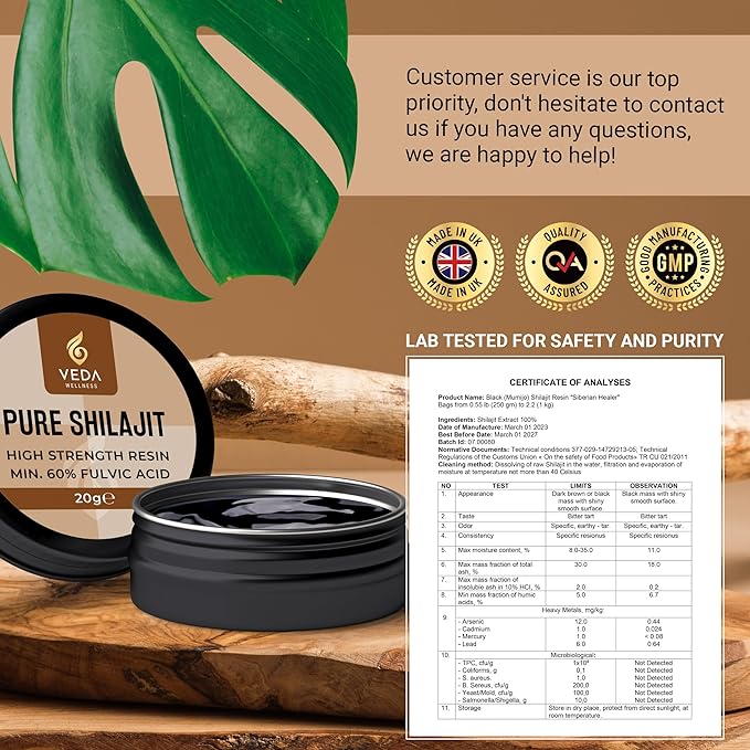 ✔ ВЫСОКОКАЧЕСТВЕННЫЕ ИНГРЕДИЕНТЫ - Высокопрочная смола экстракта мумие Veda традиционно была изготовлена для максимального усвоения и максимальной биодоступности. Он был изготовлен вручную (без машин) с использованием щадящего процесса для сохранения ферментативной ценности и эффективности. Каждая партия проходит строгий контроль качества. Сделанное в Великобритании, наше чистое мумие получено из прямых источников, высокопрочное, прошедшее лабораторные испытания третьей стороной на безопасность и чистоту, высокое содержание фульвовой кислоты мин. 60% и более 84 минералов.