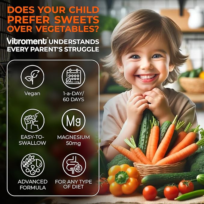 Богатая питательными веществами формула для привередливых едоков: Обеспечьте своим детям удовлетворение их ежедневных потребностей в питательных веществах с помощью наших мультивитаминных таблеток «Мои дети не будут есть овощи», разработанных для детей, которые неохотно едят овощи, обеспечивая полный спектр витаминов для здорового роста и развития.