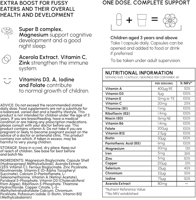 Дозировка, удобная для детей: Эти таблетки подходят для детей в возрасте от 3 лет и старше, с простыми в использовании инструкциями по добавлению капсулы в еду или напитки, что делает прием витаминов беспроблемной частью повседневной жизни вашего ребенка.