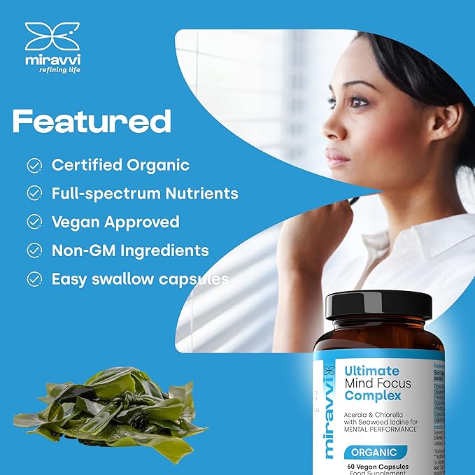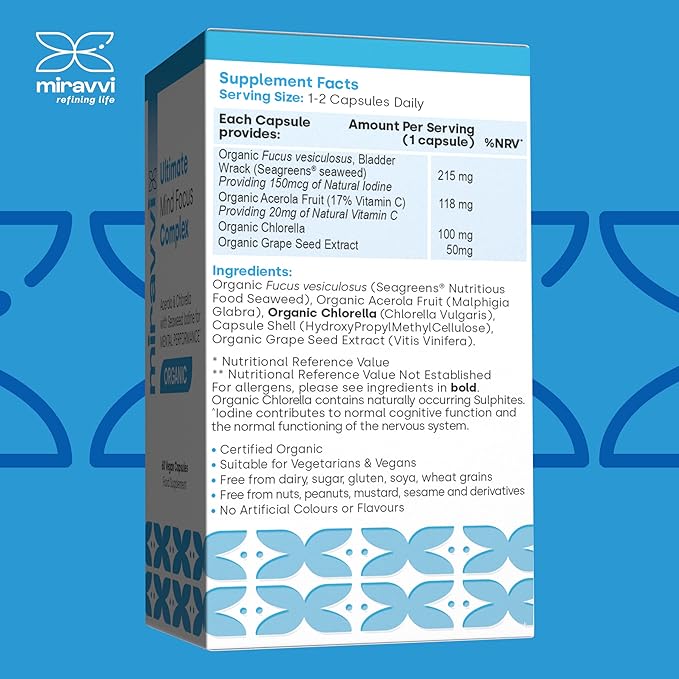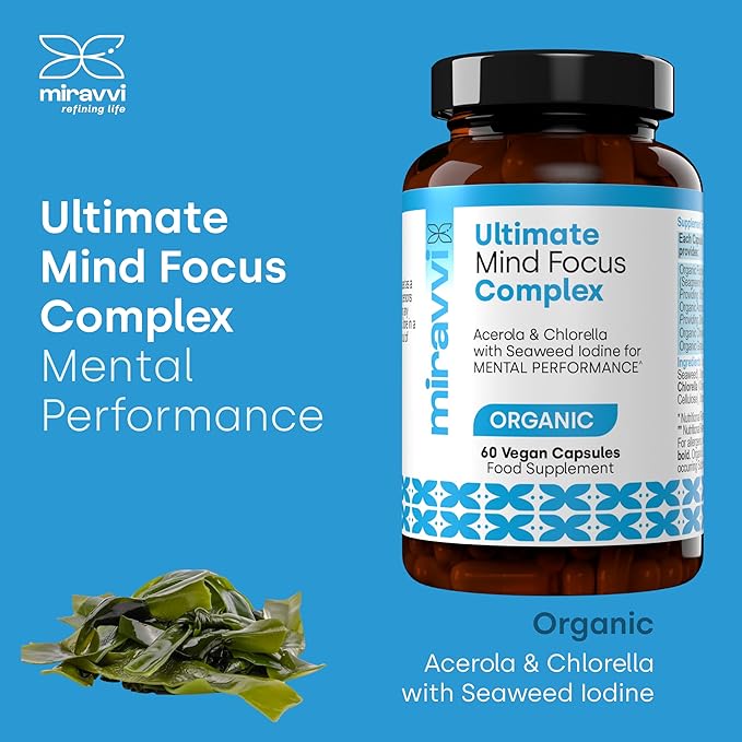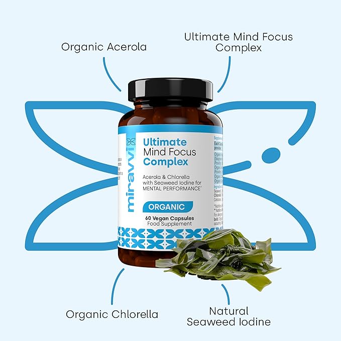✔ КОМПЛЕКС АБСОЛЮТНОЙ КОНЦЕНТРАЦИИ УМА. Органическая хлорелла 100 мг и экстракт виноградных косточек 50 мг в сочетании с морскими водорослями, свежим арктическим фукусом, для Ultimate Mind Focus смешаны с натуральным витамином С из плодов ацеролы 118 мг и натуральным йодом, обеспечивая максимальное усвоение для усиления пользы и повышения вашей умственной работоспособности. Каждая капсула легко проглатывается/