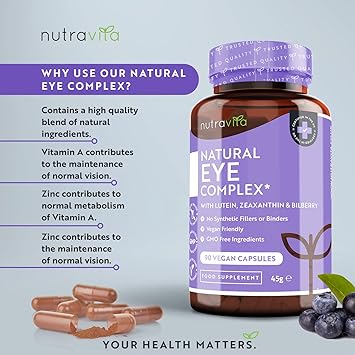 ✔︎ ПОЧЕМУ НАТУРАЛЬНЫЙ КОМПЛЕКС ДЛЯ КОЖИ ВОКРУГ ГЛАЗ NUTRAVITA? – Каждая капсула в нашем натуральном комплексе для глаз содержит лютеин (20 мг), зеанксантин (2,5 мг), экстракт черники (6 мг) и незаменимые витамины для глаз, такие как витамины А (800 мкг), В12 (400 мкг) и цинк (10 мг). Каждая бутылка нашей добавки содержит 90 легко проглатываемых веганских капсул на 3 месяца.