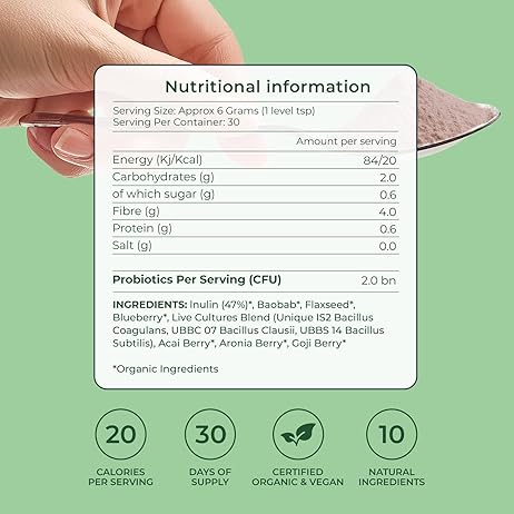Ингредиенты: Инулин (47%)*, баобаб*, семена льна*, голубика*, смесь живых культур (уникальные изолят IS2 Bacillus Coagulans, UBBC 07 Bacillus Clausii, UBBS 14 Bacillus Subtilis), ягоды асаи*, ягоды аронии*, ягоды годжи* *Органические ингредиенты