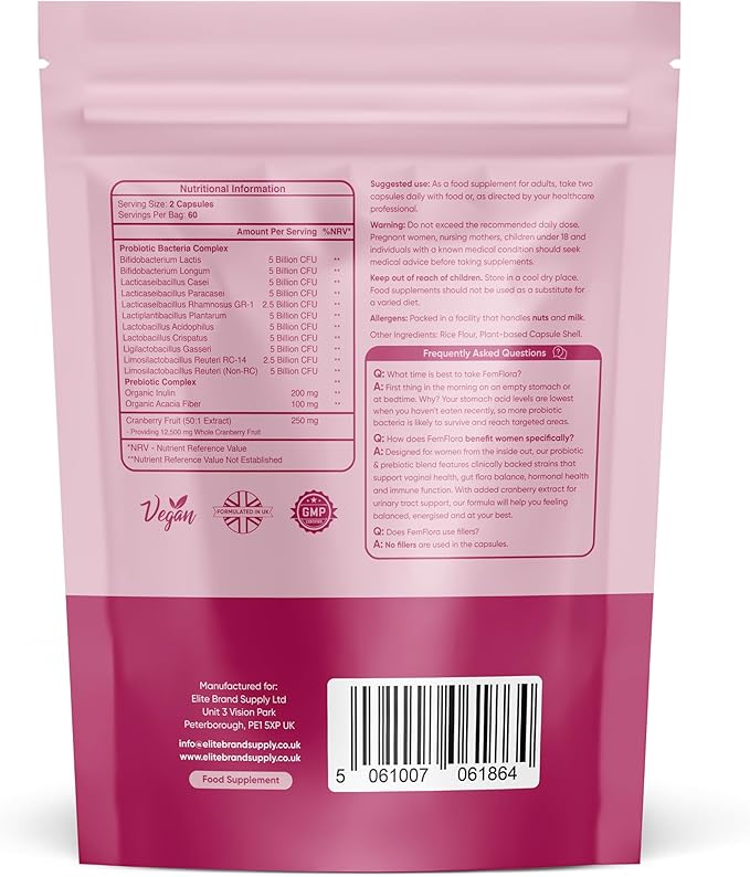 КОМБИНИРОВАННАЯ ФОРМУЛА ПРОБИОТИКОВ И ПРЕБИОТИКОВ:Наша добавка предлагает комплексное решение для здоровья кишечника, сочетая преимущества как пробиотиков, так и пребиотиков в одной мощной формуле. Пробиотики вводят в кишечник полезные бактерии, тогда как пребиотики служат питанием для этих пробиотиков, помогая им развиваться и работать более эффективно. Эта тщательно разработанная смесь также усилена экстрактом клюквы для поддержания здоровья влагалища и мочевых путей.