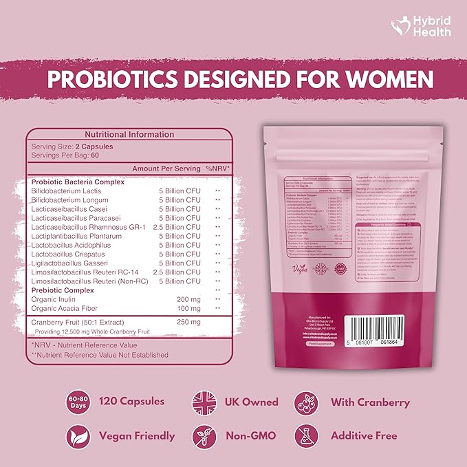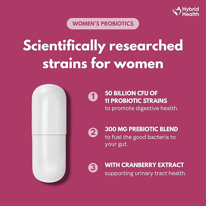 50 МИЛЛИАРДОВ КОЕ С ПОДДЕРЖКОЙ КЛЮКВЫ И ПРЕБИОТИКОВ: Пробиотики Hybrid Health для женщин предоставляют 50 миллиардов живых культур на порцию в сочетании с 12 500 мг мощного экстракта клюквы и 300 мг целевого пребиотического комплекса — тщательно разработанного для поддержки женского здоровья.