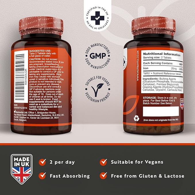 ✔ ПОЧЕМУ БИСГЛИЦИНАТ ЖЕЛЕЗА ОТ NUTRAVITA? - Наша высокоэффективная добавка с железом содержит 28 мг, что составляет 200% от суточной нормы NRV, в таблетке, которую легко проглотить. Каждая ежедневная порция из 2 таблеток обеспечивает высокоусвояемую форму железа, которая более щадяще воздействует на желудок, чем другие добавки железа. Каждая бутылка содержит 180 таблеток железа, подходящих для веганов, что обеспечивает 3-месячный запас.