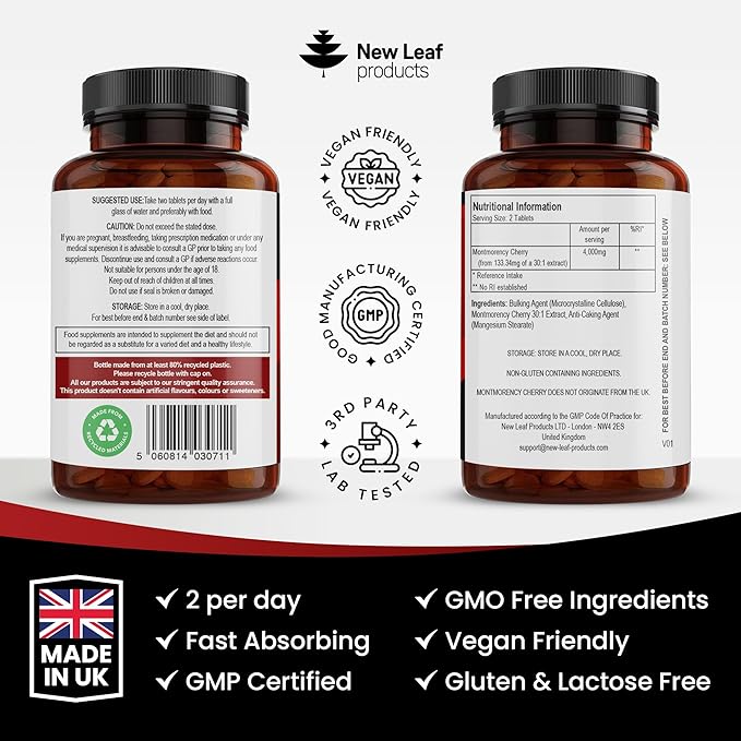 ПОДХОДИТ ДЛЯ ВЕГАНОВ И ПРЕМИУМ КАЧЕСТВА - Каждая таблетка содержит чистый экстракт терпкости, не содержит ГМО и не содержит сахара или красителей. Изготовлено в соответствии со стандартами GMP. Производству добавок New Leaf Tart Cherry уделяется большое внимание на всех этапах от сырья до доставки.