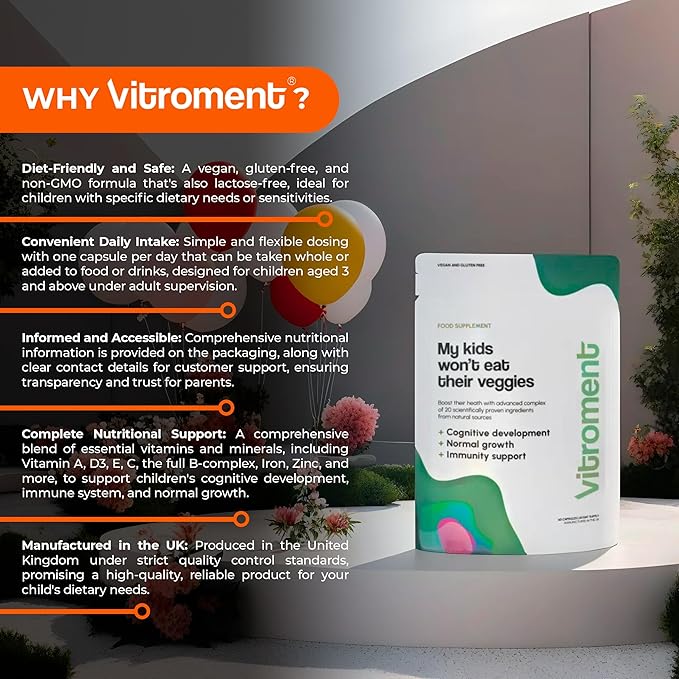 Богатая питательными веществами формула для привередливых едоков: Обеспечьте своим детям удовлетворение их ежедневных потребностей в питательных веществах с помощью наших мультивитаминных таблеток «Мои дети не будут есть овощи», разработанных для детей, которые неохотно едят овощи, обеспечивая полный спектр витаминов для здорового роста и развития.