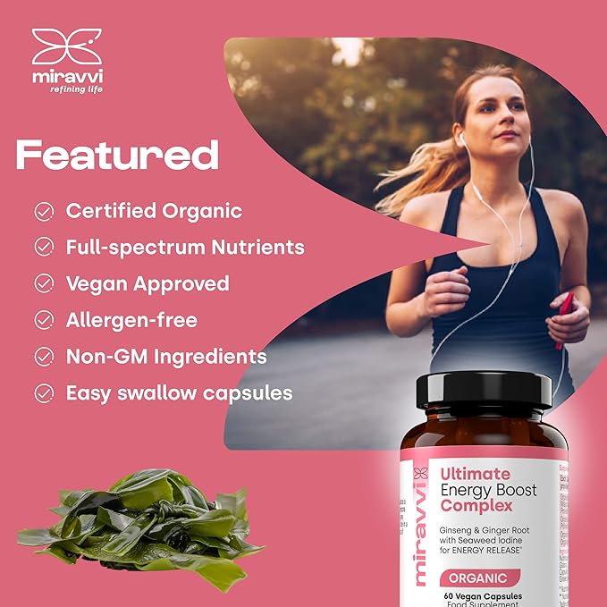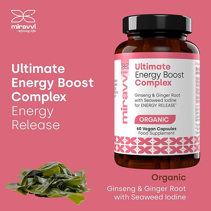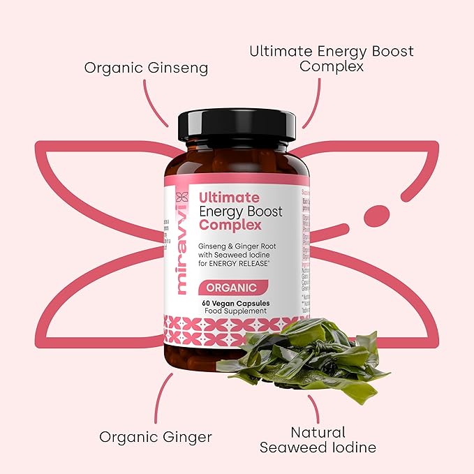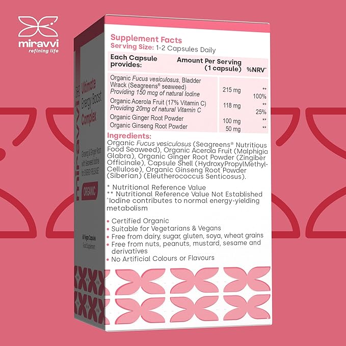✔ КОМПЛЕКС ULTIMATE ENERGY BOOST. Органический порошок корня женьшеня 50 мг и органический порошок корня имбиря 100 мг в сочетании с морскими водорослями морской зелени, арктическим свежим фукусом везикулосом, морскими водорослями 215 мг для максимального повышения энергии смешаны с натуральным витамином С из плодов ацеролы 118 мг и натуральным йодом, обеспечивая максимальное усвоение для усиления пользы и повышения уровня энергии. Каждая капсула легко глотается и подходит для веганов и вегетарианцев.