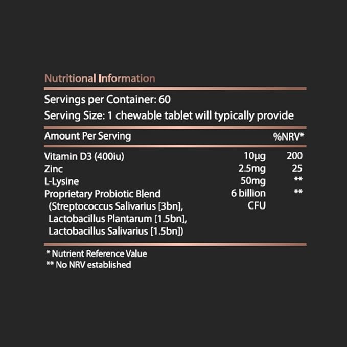 Сорбитол, маннит, микрокристаллическая целлюлоза, запатентованная смесь пробиотиков (Streptococcus Salivarius, Lactobacillus Plantarum, Lactobacillus Salivarius), гидрохлорид лизина, натуральный ароматизатор (ментол), экстракт бамбука, цитрат цинка, стеариновая кислота, витамин D3 (веганский холекальциферол).