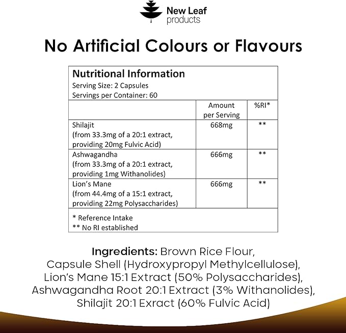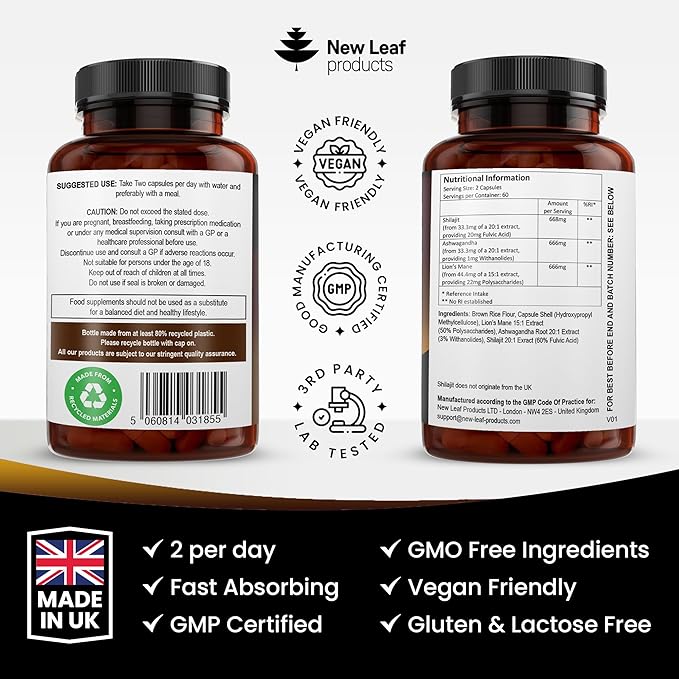 ОТКРОЙТЕ ДЛЯ СЕБЯ СИЛУ КОМПЛЕКСА МУМИЕ NEW LEAFS - Погрузитесь в древнюю мудрость с комплексом мумие от New Leafs, мощной смесью традиционных элементов, предлагающей 120 капсул в бутылке для двухмесячного запаса. Каждая порция содержит 2000 мг мумие, обогащенного экстрактом корня ашваганды и экстрактом гриба львиная грива. Мумие, добываемое в нетронутых высотах Гималаев, представляет собой смолу, известную своим богатым содержанием 60% фульвокислоты, повышающей общую эффективность смеси.