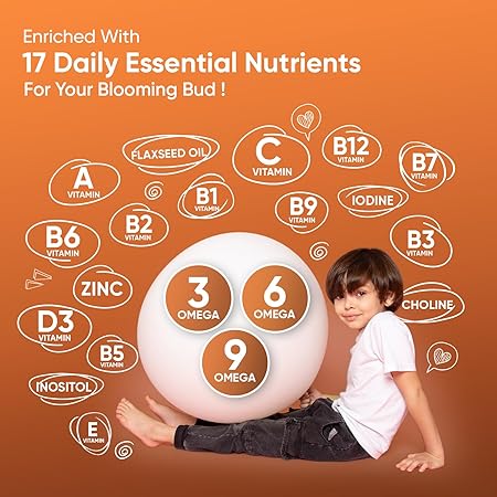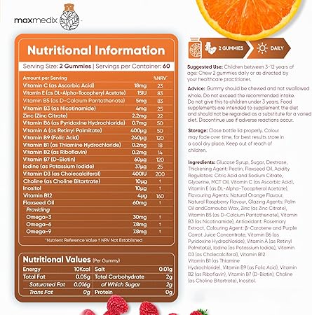 Единственный поливитамин для детей с 17 необходимыми веществами, включая Омега: Беспокоитесь, что ваш ребенок не получает необходимое питание? Наши детские жевательные витамины помогут! Витамины для детей от maxmedix содержат 17 питательных веществ (наибольшее количество необходимых элементов на рынке), такие как витамины A, B1, B2, B3, B6, B9, B12, B7, B5, C, D3, E, холин, инозитол, цинк и йод, а также масло льняного семени, обеспечивающее Омега-3, 6 и 9.