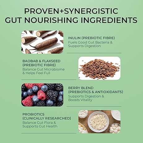 10-в-1 суперфуд порошок для здоровья кишечника - Каждая порция сочетает в себе семь суперфудов, богатых пребиотическими волокнами, с тремя уникальными штаммами пробиотиков (2 миллиарда КОЕ на порцию), способствующими сбалансированной микробиоте, регулярности и общему благополучию.