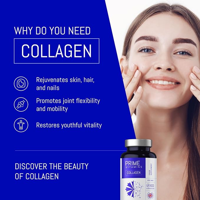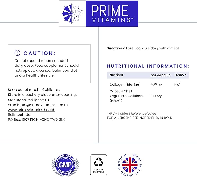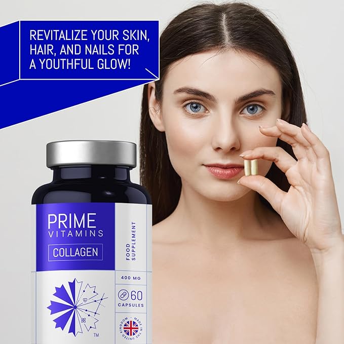 ОМОЛАЖАЙТЕ СВОЮ КОЖУ: ощутите сияние молодости и улучшенную эластичность кожи, как никогда раньше, с нашими капсулами PRIME VITAMINS Marine Collagen 400 мг. Наши коллагеновые добавки для женщин и мужчин повышают упругость кожи и уменьшают признаки старения благодаря силе гидролизованного морского коллагена. Отлично подходит для тех, кто ищет коллаген для омоложения кожи и сияющего цвета лица.