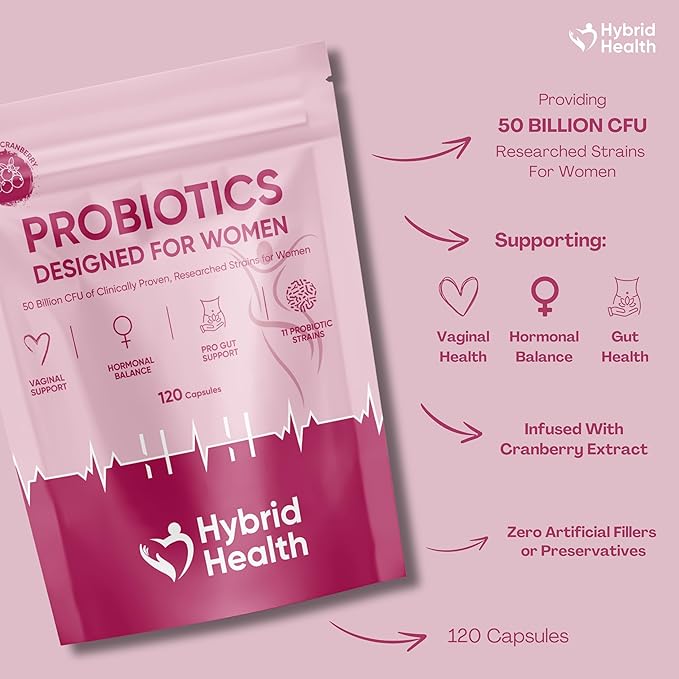 50 МИЛЛИАРДОВ КОЕ С ПОДДЕРЖКОЙ КЛЮКВЫ И ПРЕБИОТИКОВ: Пробиотики Hybrid Health для женщин предоставляют 50 миллиардов живых культур на порцию в сочетании с 12 500 мг мощного экстракта клюквы и 300 мг целевого пребиотического комплекса — тщательно разработанного для поддержки женского здоровья.