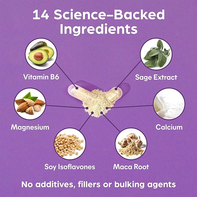 ? НАУЧНО ОБОСНОВАННЫЕ ИНГРЕДИЕНТЫ - Каждая капсула, разработанная опытными диетологами, содержит чистые и эффективные ингредиенты, включая витамин B6, льняное масло, корень маки, изофлавоны сои и экстракт шалфея, которые обеспечивают эффективное облегчение распространенных симптомов менопаузы, таких как приливы, ночная потливость и усталость.